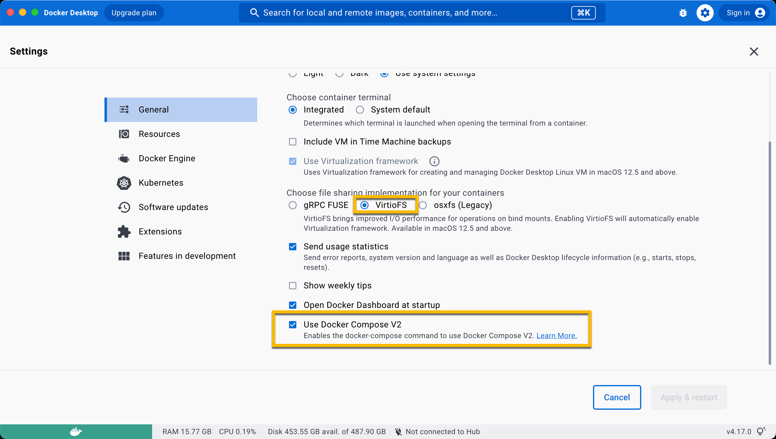 VirtioFS file sharing implementation is enabled in the docker settings.
