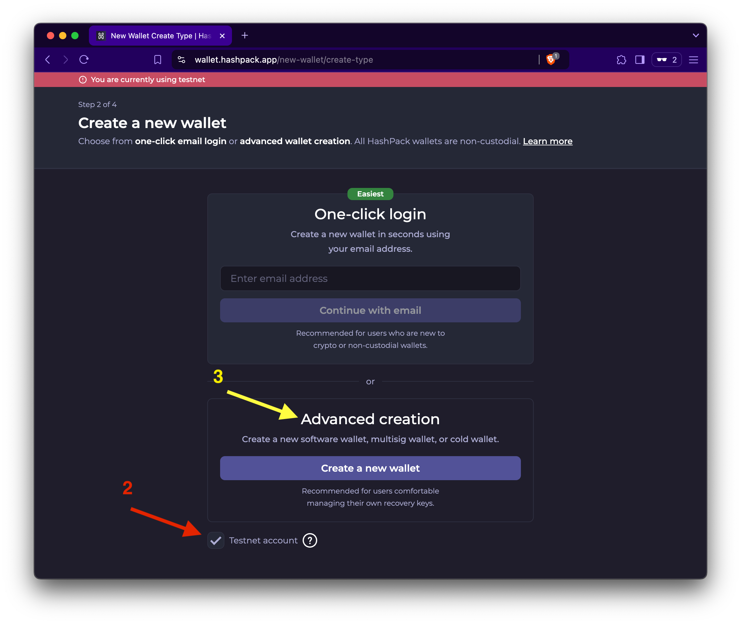 2. Check the Testnet Account box below Advanced Creation.
