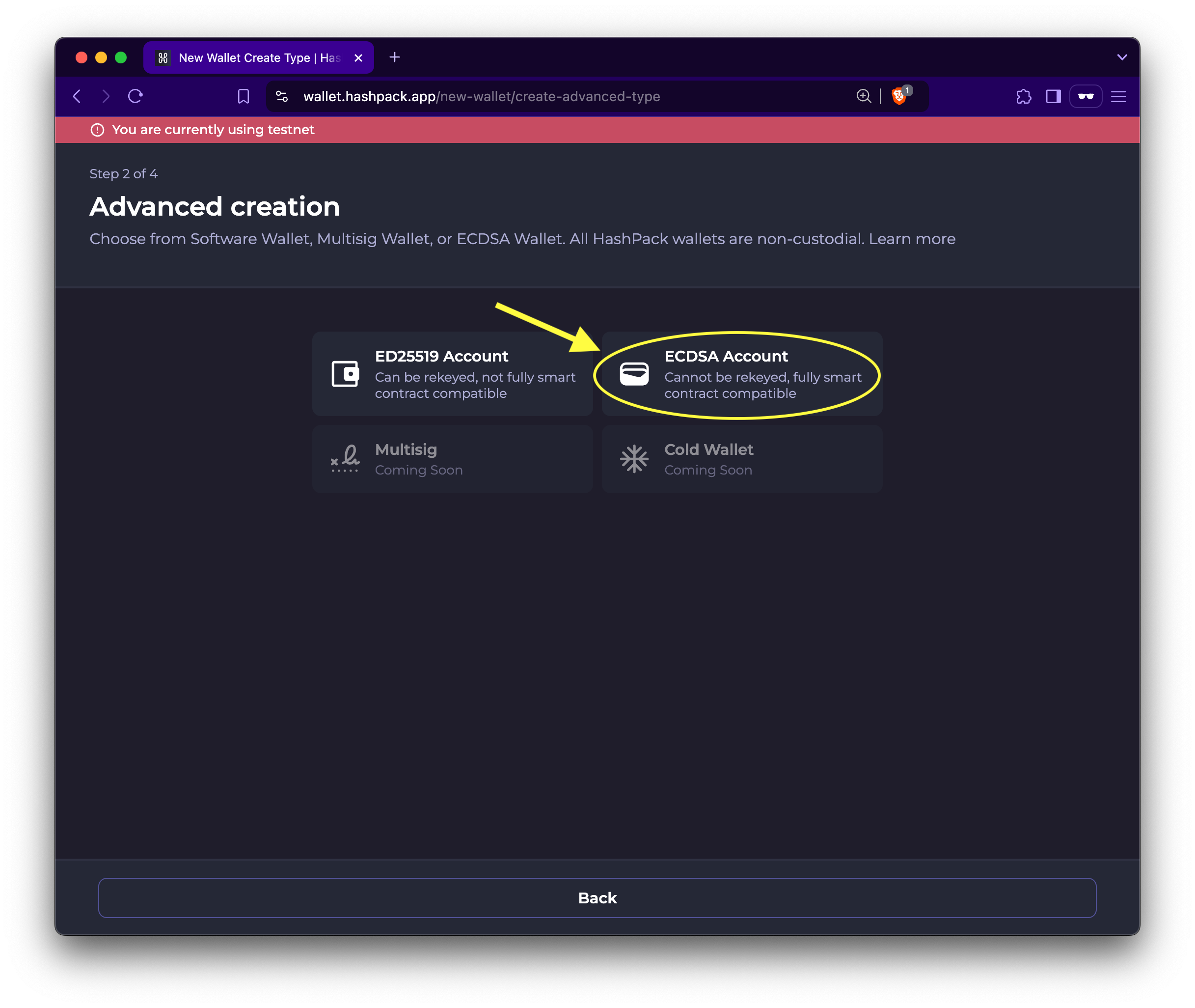 1. Select ECDSA Account to create an ECDSA testnet account.