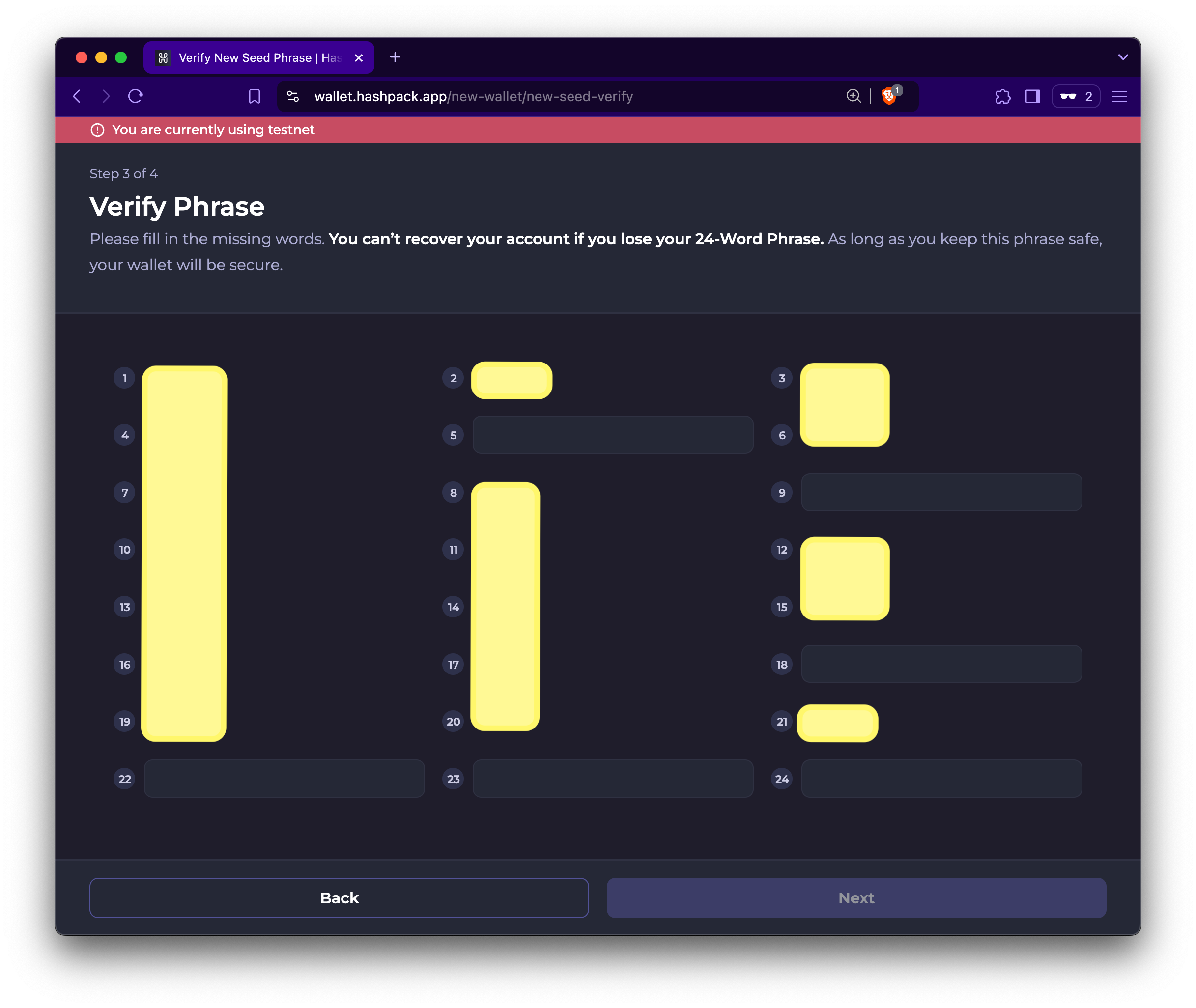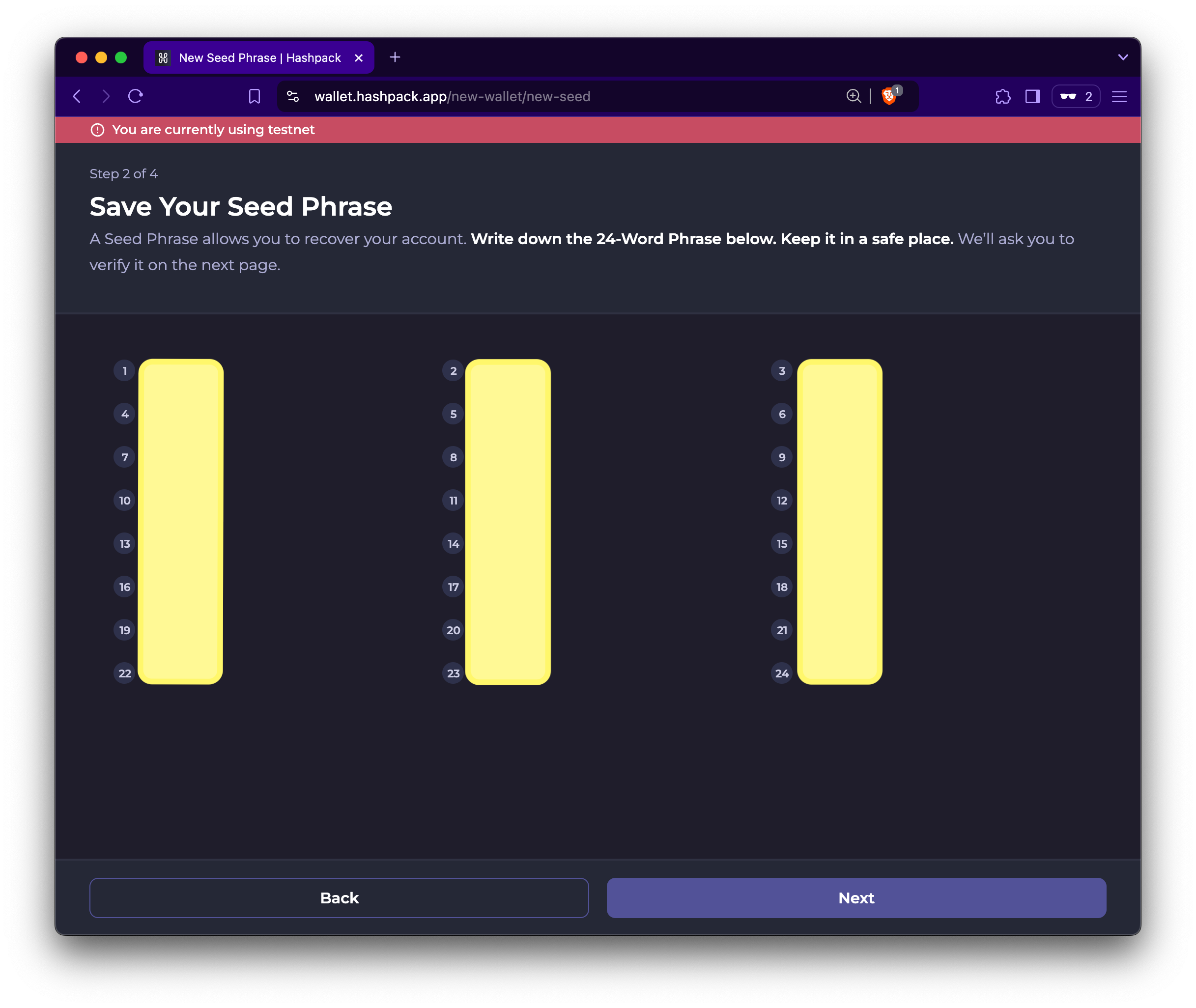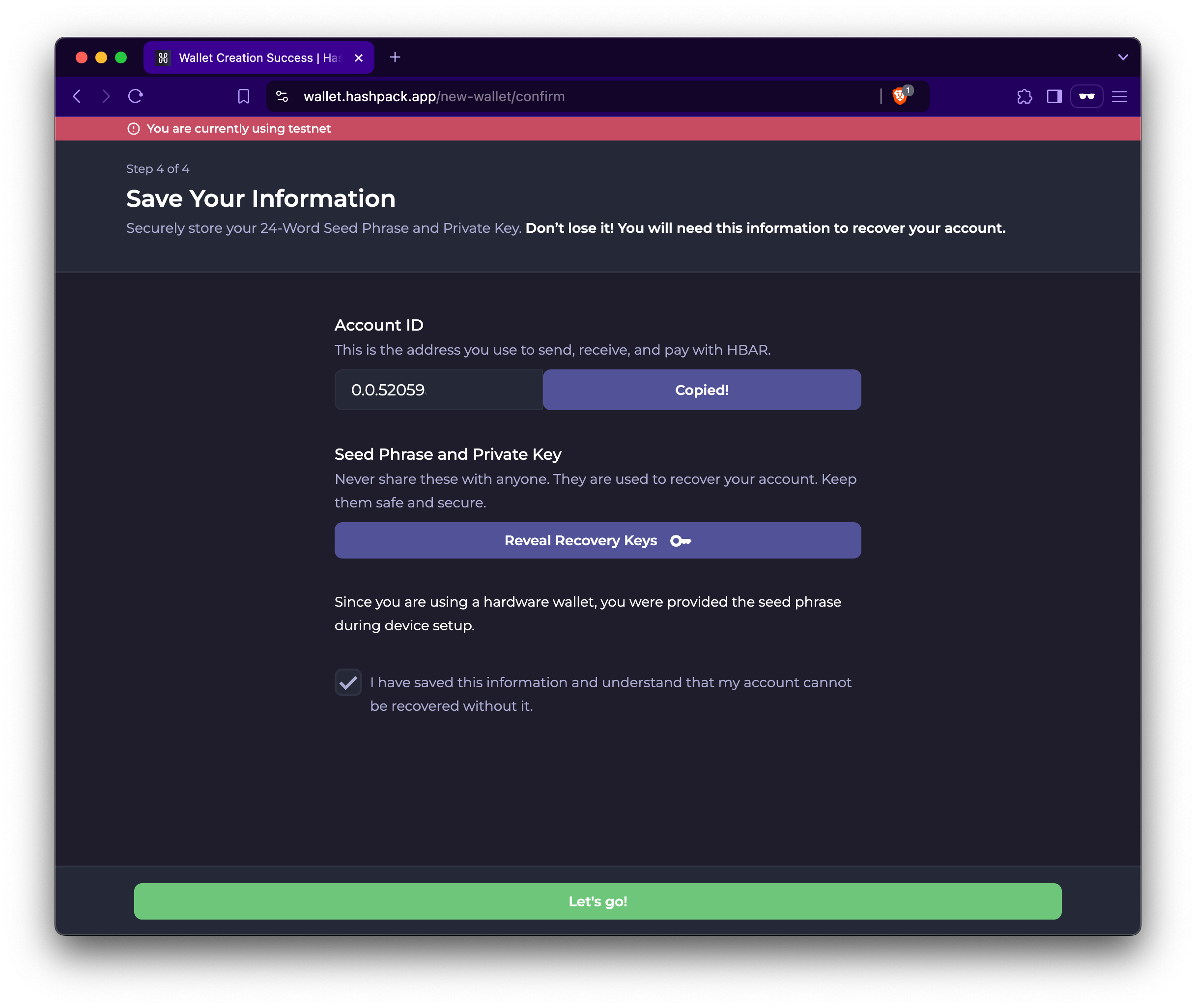 1. Verify your new account seed phrase and save your recovery keys.