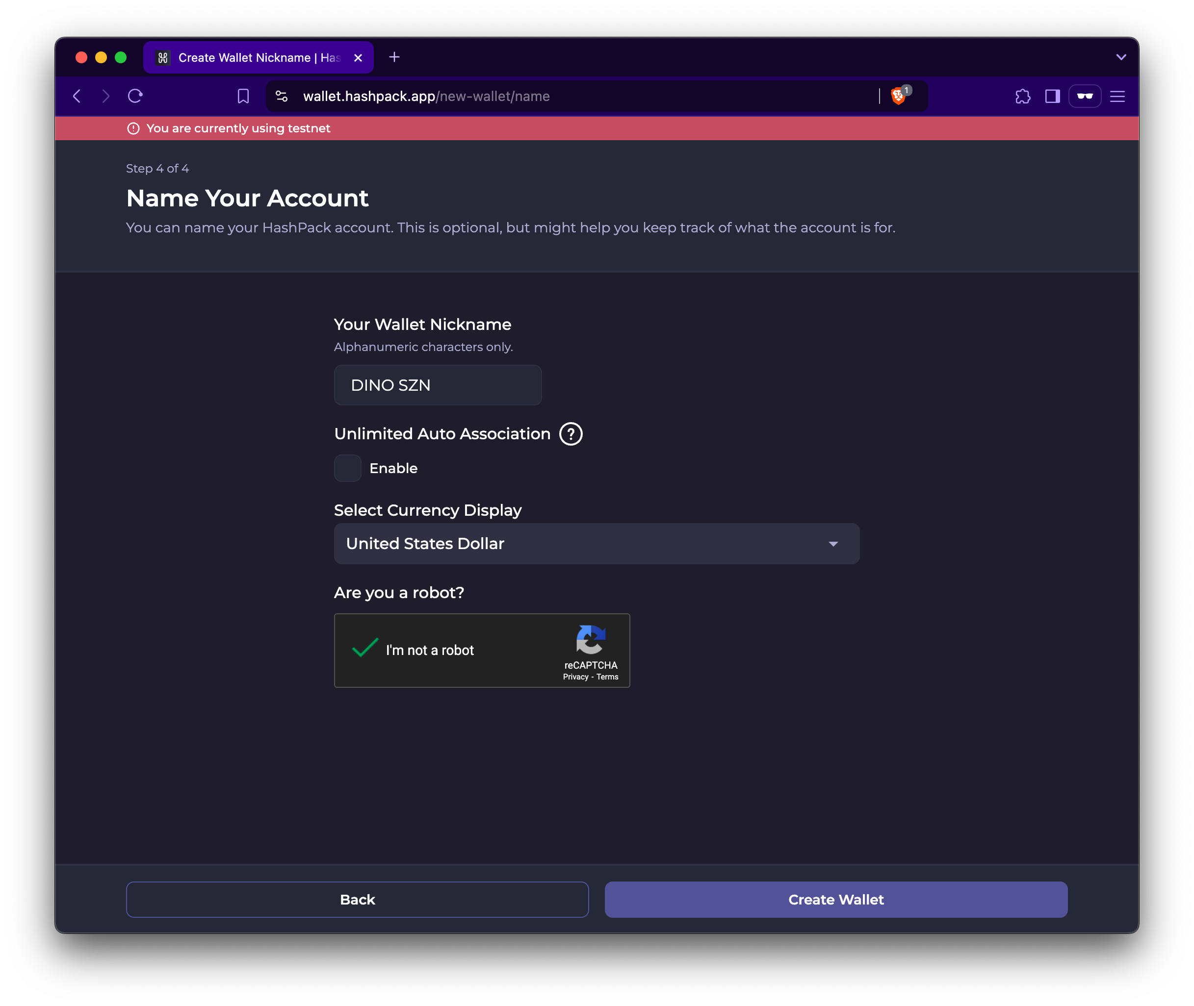 1. Give your new account a nickname (e.g., DINO SZN 🦖) and click Create Wallet.