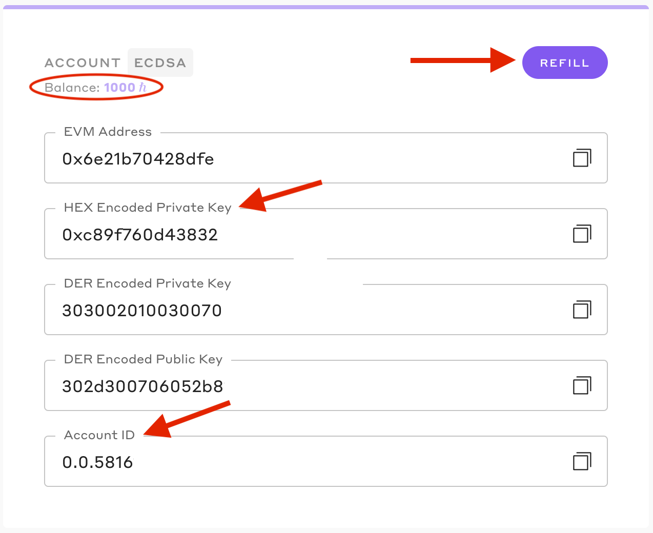 Once your testnet account is created, it will automatically be funded with 1000 HBAR. From the portal dashboard, you can view your account ID and key pair. Copy and securely save your HEX-encoded private key to configure your development environment later.