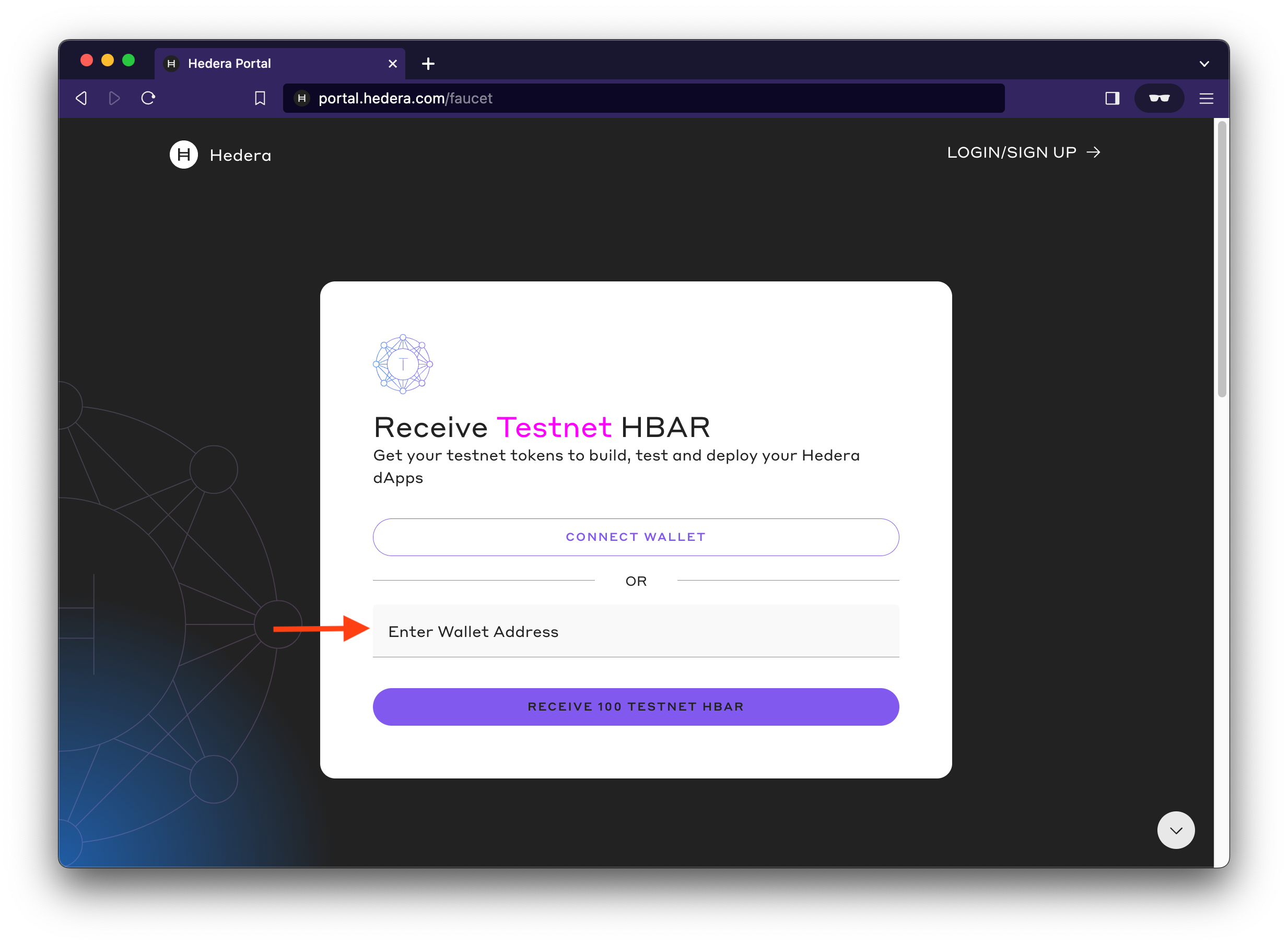 Enter your EVM wallet address in the ‘Enter Wallet Address’ field. This initiates an auto account creation flow that automatically creates a new Hedera Testnet account with 100 testnet HBAR.