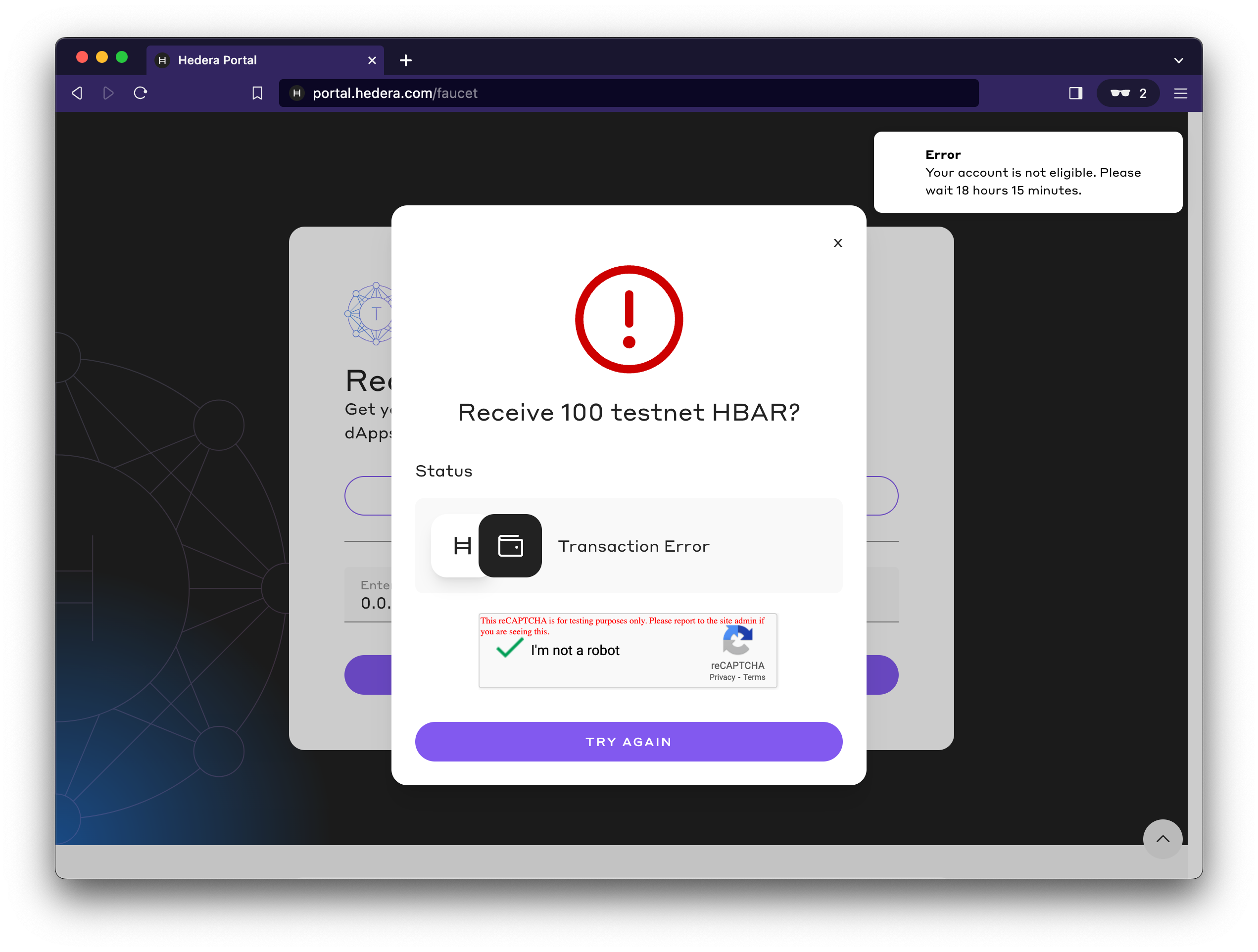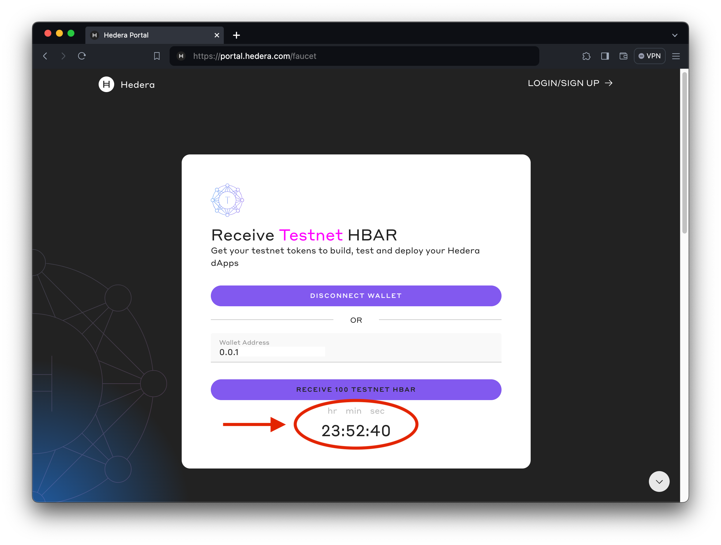 Faucet Dispense LimitThis faucet can dispense a maximum of 100 HBAR every 24 hours. If you try to use the faucet before the timer runs out, you’ll get the above error message. See the below image for the timer countdown and an example error message.