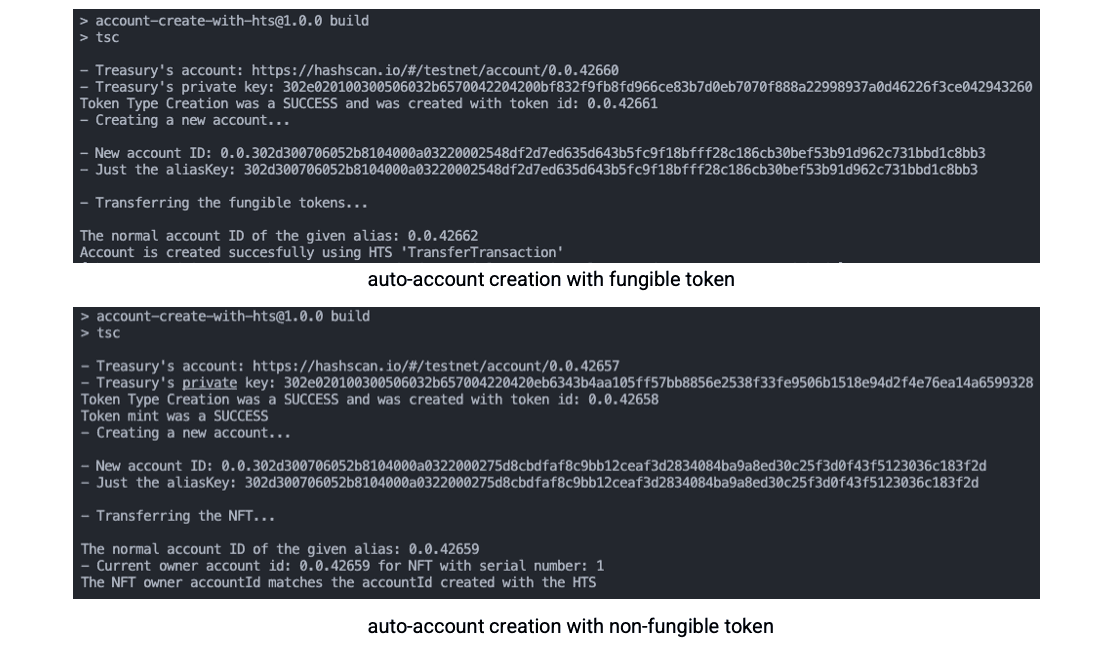 : console.log("Creating account with HTS using public key alias failed");